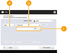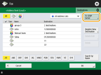 <Register New Destination>, <Details/Edit> e <Delete> na tela <Address Book (Local)> pode ser usado para registrar novos destinos, verificar detalhes e editar/excluir destinos. Para usar o Catálogo de endereços remoto, é necessário definir as configurações da máquina de servidor. Configure para abrir o Catálogo de endereços remoto externamente na máquina de servidor. |