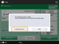 Para verificar o número total de destinos especificadosO número total de destinos especificados é exibido no canto superior direito da tela. Isso permite que você confirme que o número de destinos está correto antes do envio. ![]() Para enviar com informações do emissorVocê pode enviar com o nome e o número de fax do remetente. <TX Terminal ID> Para verificar o status dos documentos enviadosNa tela<Status Monitor/Cancel>, você pode verificar o status dos documentos enviados. Esta tela permite que você envie faxes novamente ou cancele o envio depois de verificar o status. Verificando o status e o registro de documentos enviados e recebidos Quando<Display Notification When Job Is Accepted> estiver configurado como <On>, a tela <Status Monitor/Cancel> poderá ser exibida a partir da seguinte tela, que é exibida depois que um trabalho enviado é recebido. <Display Notification When Job Is Accepted> ![]() Quando ocorre um erro de transmissão porque a linha do destinatário está ocupadaA máquina disca de novo automaticamente depois de um determinado período de tempo. Você pode alterar as configurações, como o número de vezes que a máquina disca novamente e o intervalo entre as discagens. <Auto Redial> Para imprimir o relatório dos resultados de envioNa tela de Recursos básicos de fax, pressionar <Options> <TX Report> possibilita que você configure a impressão automática do relatório que lista os resultados de envio.Para configurar essa opção para todos os trabalhos de <Options>, é necessário selecionar <For Error Only> ou <Off> em <TX Report> e depois configurar <Allow Printing from Options> como <On>. Quando várias folhas são alimentadasA digitalização é interrompida e a mensagem é exibida na tela. Siga as instruções para limpar o encravamento. Quando você limpar o encravamento, a tela de retomar o trabalho será exibida. Se a máquina detectar o carregamento de múltiplas folhas por engano, pressione <Do Not Detect Multi. Sheet Feed> para retomar a digitalização. Para configurar a máquina com antecedência para que não notifique o carregamento de múltiplas folhas, realize uma das operações a seguir. Sempre que fizer o envio, pressione <Options> na tela de Recursos básicos de fax selecione <Detect Feeder Multi Sheet Fd.> para desabilitar a configuração. Configure <Set Detection of Feeder Multi. Sheet Feed as Default> como <Off> (<Set Detection of Feeder Multi. Sheet Feed as Default>). Quando fotos nas imagens enviadas estão escuras demais ou cores claras no plano de fundo de originais coloridos não podem ser removidasA qualidade das imagens enviadas pode ser melhorada se as seguintes condições/configurações são atendidas. Tipo de trabalho: fax (envio de memória) ou digitalizar e enviar (fax/I-fax) <Select Color>: <Black & White> (Digitalizar e enviar) <Original Type>: <Text> <Density> <Background Density>: <Auto><Resolution>: 200 dpi x 400 dpi, 300 dpi x 300 dpi*, 400 dpi x 400 dpi ou 600 dpi x 600 dpi* *Pode ser configurado como Digitalizar e Enviar <Speed/Image Quality Priority for B&W Scan> Fax/I-Fax Send Jobs: <Quality Priority> (<Speed/Image Quality Priority for B&W Scan>)Quando múltiplas linhas telefônicas são configuradasVocê pode selecionar a linha telefônica que será usada para enviar faxes pressionando <Options> <Select Line>. Para instruções sobre como especificar as configurações da linha de fax, consulte Configurações da linha de fax. |