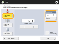 <Erase Frame>.1 | Pressione <Erase Original Frame> e verifique <Original Size>. ![]() Se o tamanho exibido em <Original Size> for diferente do tamanho do original, pressione <Change> para selecionar o tamanho. Você pode apenas configurar o modo Apagar Margem do Original para os tamanhos de original mostrados no display de toque. |
