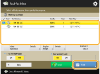 Pressionar <Details> possibilita verificar a informação do documento, incluindo os nomes dos remetentes e o número de páginas recebidas. Pressione <Display Image> para verificar os conteúdos do documento, bem como selecionar e excluir páginas.