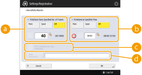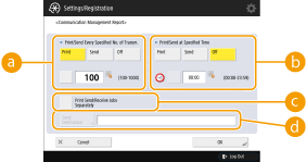 Você não pode definir as configurações de relatório de gerenciamento de comunicações enquanto <Display Job Log> em <Management Settings> está configurado como <Off>. Além disso, se você alterar <Display Job Log> em <Management Settings> de <Off> para <On>, <Print/Send Every Specified No. of Transm.> e <Print/Send at Specified Time> no relatório de gerenciamento de comunicações automaticamente serão alterados para <Off>. |