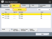 Especificando/registrando destinos a partir do histórico de enviosÉ possível especificar e registrar destinos em no catálogo de endereços a partir do histórico de envios na tela de <Status Monitor/Cancel>. Isso evita o trabalho de inserir o endereço manualmente e também ajuda a evitar que o envio seja feito a um destino incorreto por um erro de digitação. Ao especificar um destino: <Status Monitor/Cancel> <Send> <Job Log> selecione o destino para enviar para <Specify as Send Destination> <OK> Ao registrar um destino: <Status Monitor/Cancel> <Send> <Job Log> registre o destino a partir da tela de registro para cada tipo de destino |