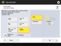 1 | Selecione <OOXML> <Word>.![]() ![]() Para mudar o idioma escolhido para uso de OCR, pressione <Change> selecione um idioma ou grupo de idiomas pressione <OK>.Selecione um idioma ou grupo de idiomas de acordo com o idioma usado nos documentos digitalizados. |