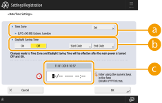 Se você alterou a configuração de <Time Zone> ou <Daylight Saving Time>, será necessário reiniciar a máquina apertando o botão DESLIGAR. Pressione o interruptor de alimentação para DESLIGAR a máquina (DESLIGANDO a máquina)>. Quando passarem 10 ou mais segundos após o indicador de força ter desligado, LIGUE a máquina novamente (LIGANDO a máquina).