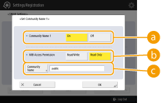 3 | Configure a comunidade. ![]() <Dedicated Community>/<Community Name 1>/<Community Name 2>Para usar a comunidade selecionada, pressione <On>. Quando não quiser usar a comunidade, pressione <Off>. <MIB Access Permission>Para cada comunidade, selecione os privilégios de acesso MIB de <Read/Write> ou <Read Only>. <Community Name>Insira um nome de comunidade à qual você pertence usando caracteres alfanuméricos. Se selecionar <Set Dedicated Community>, não poderá definir um nome de comunidade exclusivo. |