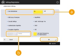 3 | Especifique as configurações necessárias e pressione <OK>. ![]() <Use Administrator>Se você usa Administrador, configure como <On>. <Encryption Password>Se você usa uma senha diferente da autenticação, desmarque a seleção <Use Same Password as for Authentication>, pressione <Encryption Password> e insira a senha. ![]() Se o "Administrador" estiver desabilitado, você não poderá configurar <Administrator Settings> (a configuração de <Use Administrator> é fixada como <Off>). |