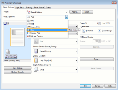 Selecione [Store] em [Job Processing] do painel [Special Features].