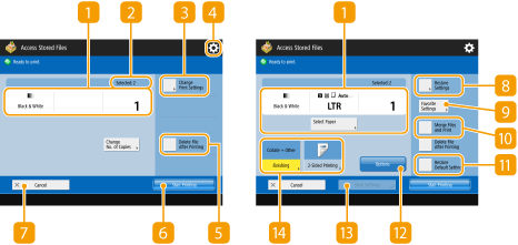 Imprime múltiplos arquivos selecionados como um só arquivo. O arquivo é impresso usando as configurações registradas em <Change Default Settings> em vez das configurações de impressão armazenadas em cada arquivo. <Access Stored Files Settings>