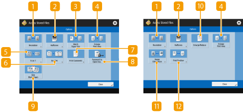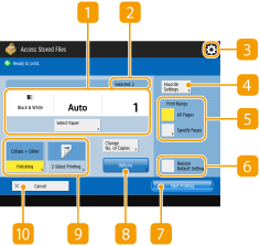 Ao pressionar <Access Stored Files> na tela do <Main Menu> e depois pressionar <Mail Box>, <Advanced Box>, <Network> ou <Memory Media> para imprimir arquivos, a seguinte tela de configuração será exibida.