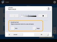 ![]() | Vous pouvez régler la densité du fond. Cela vous permet de faire des copies claires des originaux, comme des journaux ou des originaux avec des fonds colorés. Réglage de la densité du fond des copies |