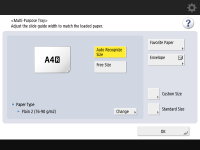 O tipo de papel de envelope não pode ser selecionado na tela de detalhes <Paper Type>. Para selecionar o tipo de papel de envelope, registre o tipo de papel em <Register Favorite Paper (Multi-Purpose Tray)> e depois pressione <Favorite Paper> na etapa 2  o botão ao qual o tipo de papel de envelope foi registrado  <OK>. Registrando tamanho e tipo de papel usado com frequência na bandeja multiuso