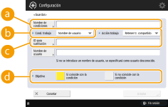 <Acción trabajo> Seleccione cómo manejar los documentos que cumplan las condiciones. Si selecciona <Retener tr. compartido>, puede establecer <ID para sustitución> para especificar la salida de nombre de usuario en el registro durante la impresión. Seleccione <Cancelar> para descartar el documento. <Objetivo>Puede establecer un valor especificado por la operación objetivo, o uno no especificado. |