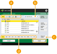<Guardar nuevo dest.>, <Detalles/Editar> y <Eliminar> en la pantalla de <Libreta de direcciones (local)> puede utilizarse para registrar nuevos destinos, comprobar detalles y editar/eliminar destinos. Registro de destinos Para utilizar la libreta de direcciones remotas, es necesario configurar los ajustes del equipo servidor. Establezca en abierto la libreta de direcciones remota de forma externa en el equipo servidor. |