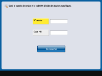 4 | Saisissez <N° de service> et <Code PIN> et appuyez sur <OK>.Confirmez le PIN, puis appuyez sur <OK>. Vous n'êtes pas autorisé à définir un code PIN ou numéro de service ne comprenant que des zéros comme « 00 » ou « 0000000 ». Même si vous saisissez moins de sept chiffres, des zéros sont ajoutés au début du nombre et un nombre à sept chiffres est défini. Cependant, les zéros au début du nombre peuvent être omis lors de la connexion. Par exemple, même si vous entrez <2>, <02> ou <002>, le code défini est <0000002>. Vous pouvez alors vous connecter en entrant <2>, <02> ou <002>. Si vous ne définissez pas un code PIN, vous pouvez utiliser l'appareil en saisissant uniquement le numéro de service. |