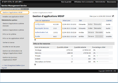 Cliquez sur [Gestion d'applications MEAP] puis sur l'application dont vous souhaitez gérer la licence.