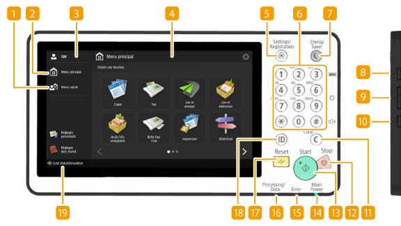 Appuyez sur cette touche pour vous connecter à l'appareil si l'authentification personnelle est nécessaire. Lorsque vous avez fini d'utiliser l'appareil, appuyez de nouveau sur cette touche pour vous déconnecter.