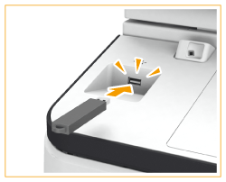 Pour imprimer directement les données stockées sur un périphérique mémoire USB, reliez ce dernier au port USB situé sur le côté gauche du panneau de commande. Vous pouvez également enregistrer directement sur le périphérique mémoire USB les originaux numérisés à l'aide de l'appareil.