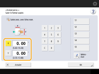 Appuyez sur <X> ou <Y> pour saisir la longueur de chaque côté avec le clavier numérique. ![]() Si vous enregistrez les formats de papier que vous utilisez fréquemment sur les touches <S1> à <S5>, vous pouvez les appeler en appuyant sur une seule touche. Enregistrement de papier de format libre (papier de format personnalisé) | |