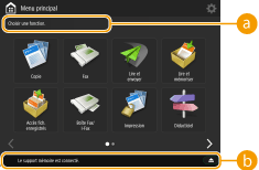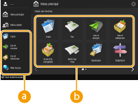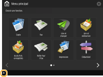 Appuyez sur les touches de fonction de l'écran <Menu principal> pour afficher l'écran Fonctions de base, qui vous permet d'accéder aux fonctions élémentaires comme la copie, la télécopie et la numérisation. L'affichage et les éléments de paramétrage de l'écran Fonctions de base diffèrent selon les fonctions ; néanmoins, vous pouvez modifier les paramètres au gré de vos besoins.
