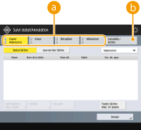(Status Monitor/Cancel), l'écran <Suivi statut/Annulation> s'affiche. Cet écran vous permet également de vérifier l'état de l'impression et de la transmission ainsi que la quantité de toner et de mémoire disponible.