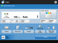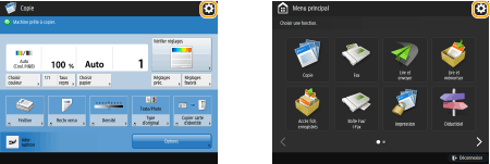 Appuyez sur la touche  affichée dans le Main Menu et sur l'écran des fonctions de base pour personnaliser l'écran, par exemple en réorganisant les touches ou en créant une touche de raccourci. Seul un administrateur peut personnaliser le Menu principal. Personnalisation de l'afficheur tactileVous pouvez modifier les paramètres d'affichage, notamment en définissant l'écran qui doit apparaître lorsque l'appareil est mis sous tension ou en indiquant si le message de niveau de papier ou de toner doit apparaître. <Réglages d'affichage> |