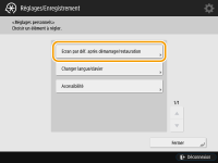 Si l'appareil est configuré de sorte que les utilisateurs doivent se connecter au démarrage de l'appareil (Spécifier quand afficher l'écran de connexion), l'option <Ecran par déf. après démarrage/restauration> s'affiche dans <Réglages personnels>. L'écran qui s'affiche au démarrage de l'appareil peut être défini pour chaque utilisateur.