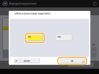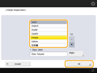 Si vous réglez l'option sur <Oui>,  apparaît en bas de l'afficheur tactile. Vous pouvez changer la langue actuellement affichée en appuyant sur la touche <Changer langue/clavier> et en sélectionnant la langue souhaitée dans la liste. Appuyez ensuite sur <OK>.