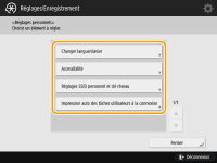 Vous pouvez modifier les boutons de réglage affichés sur l'écran des fonctions de base (pour la copie, la télécopie et la numérisation). Vous pouvez aussi afficher un écran Fonctions de base différent, personnalisé pour chaque utilisateur connecté.
