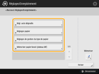 Si vous utilisez souvent la même combinaison de réglages pour la copie, la télécopie et la numérisation, il est pratique de mémoriser ces réglages en tant que <Réglages favoris>.