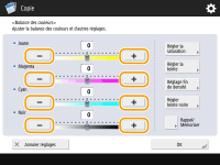 <Réglage fin de densité>Sélectionnez une couleur et ajustez son niveau de densité par sa zone de densité en utilisant le bouton <-> ou <+>. Quand l'ajustement est terminé, appuyez sur <OK>.