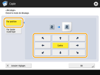 Appuyez sur <Régler> dans <Recto> et spécifiez la distance de déplacement. Appuyez sur les boutons haut/bas/droite/gauche indiquant les directions et saisissez la distance de déplacement avec le clavier numérique.