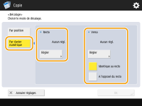 Si vous voulez déplacer l'image au dos quand vous copiez des deux côtés, vous devez spécifier le réglage <Verso>. Pour déplacer à la même position que le recto, appuyez sur <Identique au recto>. Pour déplacer symétriquement, appuyez sur <A l'opposé du recto>. Pour déplacer à une position différente du recto, appuyez sur <Régler> et saisissez la distance de déplacement.