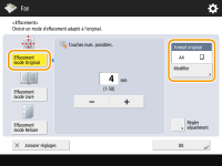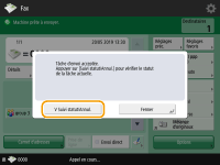 Pour vérifier le nombre total de destinataires spécifiésLe nombre total de destinataires spécifiés est affiché en haut à droite de l'écran. Cela vous permet de vérifier que le nombre de destinataires est correct avant de faire l'envoi. ![]() Pour envoyer avec les informations d'émetteurVous pouvez envoyer le fax avec le nom et le numéro de fax de l'expéditeur. <ID terminal émetteur> Pour vérifier les statuts pour les documents envoyésA l'écran <Suivi statut/Annulation>, vous pouvez vérifier les statuts pour les documents envoyés. Cet écran vous permet de renvoyer des fax ou d'annuler l'envoi après avoir vérifié les statuts. Vérification de l'état et du journal concernant les documents envoyés et reçus Lorsque <Afficher notification à l'acceptation de la tâche> est réglé sur <Oui>, l'écran <Suivi statut/Annulation> peut s'afficher à partir de l'écran suivant qui apparaît après la réception d'une tâche. <Afficher notification à l'acceptation de la tâche> ![]() Si une erreur de transmission se produit parce que la ligne du destinataire est occupéeLa machine rappelle automatiquement au bout d'un certain temps. Vous pouvez modifier les paramètres tels que le nombre de fois que la machine rappelle et l'intervalle entre les rappels. <Recomposition auto> Pour imprimer le rapport pour les résultats d'envoiSur l'écran des fonctions de base de la fonction Fax, vous pouvez appuyer sur <Options> <Rapport TX> pour pouvoir configurer l'impression automatique du rapport listant les résultats de l'envoi.Pour définir cette option pour chaque tâche à partir des <Options>, il est nécessaire de sélectionner <Erreur seulement> ou <Non> dans <Rapport TX>, puis de définir <Autoriser impression dans Options> sur <Oui>. Si plusieurs feuilles sont alimentées en même tempsLa numérisation s'arrête et le message s'affiche à l'écran. Suivez les instructions pour éliminer le bourrage papier. Une fois le bourrage éliminé, l'écran de reprise du travail s'affiche. Si l'appareil détecte par erreur le chargement de plusieurs feuilles, appuyez sur <Ne pas détecter chargeur/alim. multi> pour recommencer la numérisation. Pour configurer l'appareil à l'avance de sorte qu'il ne signale pas le chargement de plusieurs feuilles, effectuez une des opérations suivantes. A chaque envoi, appuyez sur <Options> sur l'écran des fonctions de base de la fonction Fax sélectionnez <Détecter chrgr/alim. multiple> pour désactiver le réglage.Définissez <Activer détection alim. multi. par chargeur par défaut> sur <Non> (<Activer détection alim. multi. par chargeur par défaut>). Lorsque des photos dans l'image envoyée sont trop sombres ou claires, les couleurs à l'arrière-plan des originaux en couleur ne peuvent être suppriméesLa qualité de l'image envoyée peut être améliorée si les conditions/paramètres suivants sont satisfaits. Type de tâche : Télécopie (envoi depuis la mémoire) ou Numérisation et envoi (Fax/I-fax) <Choisir couleur> : <Noir et blanc> (Numérisation et envoi) <Type d'original> : <Texte> <Densité> <Densité du fond> : <Auto><Résolution> : 200 ppp x 400 ppp, 300 ppp x 300 ppp*, 400 ppp x 400 ppp ou 600 ppp x 600 ppp* *Peut être défini pour Numérisation et envoi <Priorité vitesse/type d'image pour lecture N&B> Envois Fax/I-Fax : <Priorité qualité> (<Priorité vitesse/type d'image pour lecture N&B>)Lorsque plusieurs lignes téléphoniques sont définiesVous pouvez sélectionner la ligne téléphonique à utiliser pour envoyer des fax en appuyant sur <Options> <Sélection de la ligne>. Pour obtenir des instructions sur la spécification des réglages de ligne de fax, reportez-vous à la section Réglages de la ligne de fax. |
