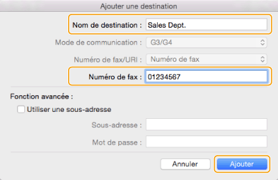 Saisissez le nom de la destination dans [Nom de destination] et le numéro de fax dans [Numéro de fax], et ensuite cliquez sur [Ajouter] [Annuler].