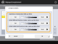 Lorsque vous déplacez le curseur vers <Foncé>, les zones imprimées de densité maximale sont renforcées. Lorsque vous déplacez le curseur vers <Faible>, les zones remplies, le texte et les lignes sont imprimées comme des demi-teintes en utilisant moins de points. Ce réglage s'utilise surtout pour ajuster les densités intermédiaires.