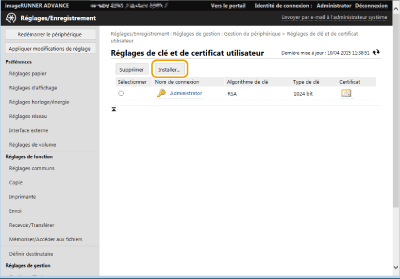 Cliquez sur [Gestion du périphérique]  [Réglages de clé et de certificat utilisateur].