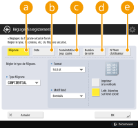 Appuyez sur <Régler> pour les fonctions pour lesquelles utiliser le marquage sécurisé des documents. Si vous sélectionnez <Régler> pour <Accès aux fichiers enregistrés>, le marquage sécurisé des documents est intégré aux fichiers stockés à leur impression. Si la fonction de verrouillage des scans est activée, appuyez sur <Filigrane sécurisé forcé> au lieu de <Régler>.