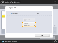 Si le réglage TPM est activé et enregistré sur la clé USB, vous pouvez mémoriser en toute sécurité sur la puce TPM la clé de cryptage (clé TPM) qui crypte les informations confidentielles telles que le mot de passe, la paire de clés publiques pour la communication SSL et le certificat d'utilisateur qui sont stockés sur la machine. Ainsi, vous pouvez éviter les fuites d'informations importantes de votre appareil. Vous pouvez aussi récupérer le système si la puce TPM ne fonctionne pas en restaurant la clé TPM.