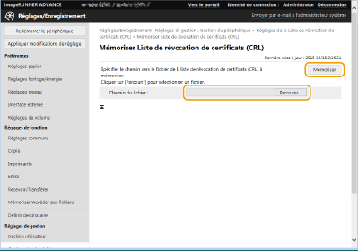 Vous pouvez utiliser l'interface utilisateur distante pour enregistrer une liste de révocation de certificat (CRL). Pour savoir quelles CRL peuvent être enregistrées sur l'appareil, voir Spécifications du système.