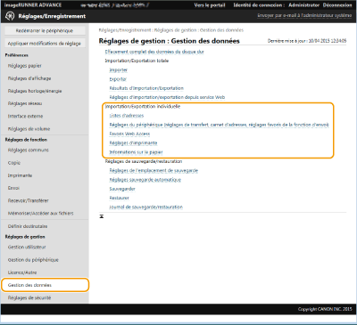 Vous pouvez sélectionner des réglages particuliers à importer ou exporter comme des listes d'adresses dans le carnet d'adresse ou des réglages d'imprimante. Des privilèges Administrateur sont requis afin de réaliser ces opérations.
