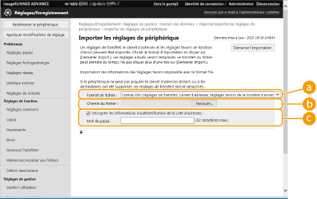 Lors de l'importation des réglages du périphérique (réglages de transfert, carnet d'adresses, réglages favoris de la fonction d'envoi)