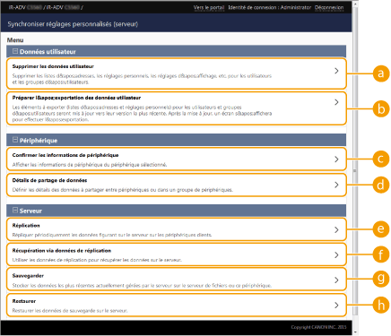 Permet de créer régulièrement des données de réplication sur une autre imprimante multifonction Canon afin de gérer les données du serveur et de les sauvegarder.