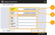 <Admin. système> / <Adresse e-mail> / <Informations contact> / <Commentaire>Saisissez les informations nécessaires sur l'administrateur.