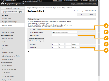 Vous pouvez enregistrer les informations, notamment le nom de l'appareil et le lieu de son installation, utilisées pour son identification. Les réglages nécessaires à l'utilisation d'AirPrint peuvent être configurés à distance depuis l'interface utilisateur distante.