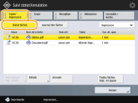 Si vous appuyez sur <Détails> après avoir sélectionné un document, vous pouvez en annuler l'impression, contrôler le statut du document, etc.