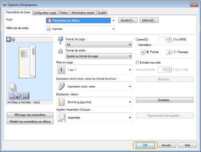 Spécifiez les réglages d'impression nécessaires et cliquez sur [OK].