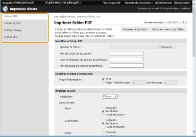 Cliquez sur [Impression directe] dans la page du portail. Ecran de l'interface utilisateur distante