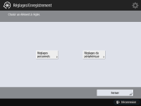 Il est possible que certains réglages ne soient pas affichés selon la configuration de l'équipement en option installé sur l'appareil. Certains changements peuvent ne pas se refléter immédiatement, en fonction des réglages. Dans ce cas, il est nécessaire de procédez à l'une des étapes suivantes. Appuyez sur <Oui> sur l'écran pour confirmer que vous voulez effectuer des modifications. Appuyez sur (Settings/Registration) <Appl. modif. régl.>.Redémarrez l'appareil. |
