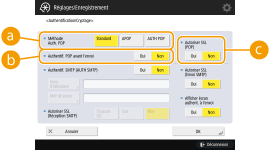 2 | Spécifiez chaque option. ![]() <Authentif. SMTP (AUTH SMTP)>Pour utiliser l'authentification SMTP, appuyez sur <Oui>, saisissez le nom d'utilisateur et le mot de passe du compte e-mail spécifié dans <Nom d'utilisateur> et <Mot de passe>. ![]() Nom d'utilisateur et mot de passe <Nom d'utilisateur> et <Mot de passe> pour <Authentification SMTP> s'utilisent également pour le transfert de documents réceptionnés. Le transfert s'effectue en tant que « Authentification du périphérique fixe » quels que soient les paramètres <Infos pour l'authentif. sur le serveur SMTP>. (<Infos pour l'authentif. sur le serveur SMTP>) <Autoriser TLS (RX SMTP)>Pour crypter les communications à l'aide du protocole TLS lors de la réception des e-mails et des I-fax avec le serveur SMTP, appuyez sur <Toujours TLS> ou <Oui>. Pour ne pas recevoir d'autres données que les données cryptées, sélectionnez <Toujours TLS>. <Afficher écran authent. à l'envoi>Pour envoyer des e-mails et des I-fax, appuyez sur <Oui> pour afficher l'écran de saisie du nom d'utilisateur et du mot de passe. <Autoriser TLS (TX SMTP)>Pour crypter les communications vers/depuis le serveur SMTP avec le protocole TLS, appuyez sur <Oui>. Si vous sélectionnez <Oui>, vous pouvez vérifier le certificat du serveur TLS pendant la communication avec le serveur et ajouter un nom commun (CN) aux éléments de vérification. <Réglages E-mail/I-Fax> <Confirmer certificat TLS pour TX SMTP>![]() En cas de configuration de l'authentification SMTP Spécifiez la méthode d'authentification en utilisant l'une des trois méthodes suivantes. Authentification d'un périphérique fixe Saisie des informations d'authentification lors de l'envoi Enregistrement des informations pour chaque utilisateur Authentification d'un périphérique fixe : si le <Nom d'utilisateur> et le <Mot de passe> saisis dans <Authentif. SMTP (AUTH SMTP)> sont utilisés et l'écran d'authentification (<Se connecter au serv. SMTP>) ne s'affiche pas lors de l'envoi Spécifiez les paramètres de la manière suivante. <Authentif. SMTP (AUTH SMTP)> : <Oui> <Nom d'utilisateur> : saisissez le nom d'utilisateur. <Mot de passe> : saisissez le mot de passe. <Afficher écran authent. à l'envoi> : <Non> <Infos pour l'authentif. sur le serveur SMTP>: <Réglages du périphérique> Saisie des informations d'authentification lors de l'envoi : si le <Nom d'utilisateur> et le <Mot de passe> saisis dans <Authentif. SMTP (AUTH SMTP)> sont utilisés et l'écran d'authentification (<Se connecter au serv. SMTP>) s'affiche lors de l'envoi le <Nom d'utilisateur> et le <Mot de passe> saisis dans <Authentif. SMTP (AUTH SMTP)> sont saisis comme informations d'authentification lors de l'envoi. Si le <Nom d'utilisateur> et le <Mot de passe> pour <Authentif. SMTP (AUTH SMTP)> ne sont pas saisis (champs vides), les informations d'authentification lors de l'envoi sont vides également. Spécifiez les paramètres de la manière suivante. <Authentif. SMTP (AUTH SMTP)> : <Oui> <Nom d'utilisateur> : saisissez le nom d'utilisateur. <Mot de passe> : saisissez le mot de passe. <Afficher écran authent. à l'envoi> : <Oui> <Infos pour l'authentif. sur le serveur SMTP>: <Réglages du périphérique> Enregistrement d'informations pour chaque utilisateur : si les <Donn. mémo. pr chq utilis.> sont utilisées et l'écran d'authentification (<Se connecter au serv. SMTP>) ne s'affiche pas lors de l'envoi L'authentification SMTP est effectuée en utilisant le nom d'utilisateur et le mot de passe enregistrés sur le périphérique local. Spécifiez les paramètres de la manière suivante. <Authentif. SMTP (AUTH SMTP)> : <Oui> <Afficher écran authent. à l'envoi> : <Non> <Infos pour l'authentif. sur le serveur SMTP>: <Donn. mémo. pr chq utilis.> |