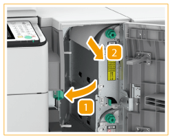 ![]() | Appuyez sur le bouton d'ouverture et ouvrez le magasin à papier. ![]() Si vous n'éliminez pas d'abord le bourrage papier à l'intérieur du capot avant, vous ne pourrez peut-être pas ouvrir le magasin à papier, même en appuyant sur le bouton d'ouverture. Si la machine est en mode veille, vous ne pourrez peut-être pas ouvrir le magasin à papier. Dans ce cas, annulez le mode veille avant d'ouvrir le magasin. |